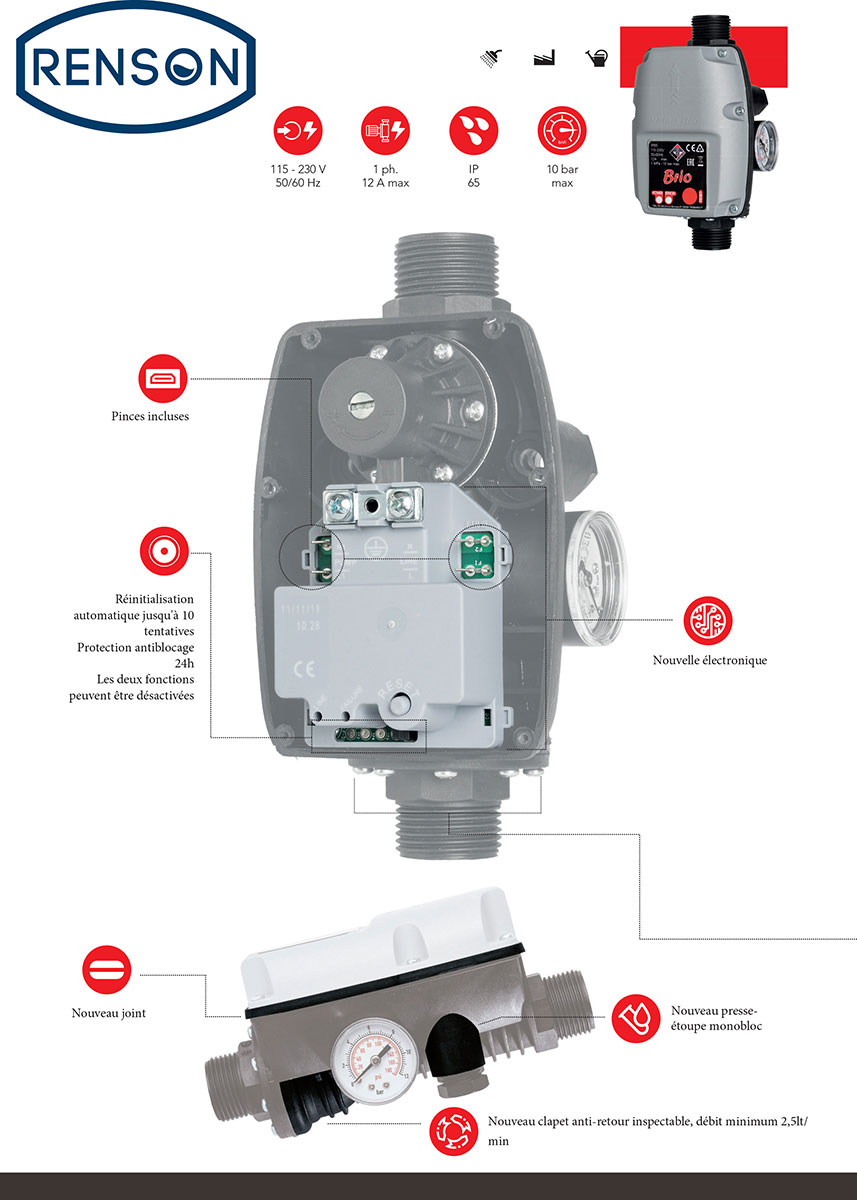 Il démarre l'électropompe après une baisse de pression (ouverture des robinets) et l'arrête lorsque le débit du fluide s'interrompt au niveau de pression maximum de l'électropompe (fermeture des robinets).