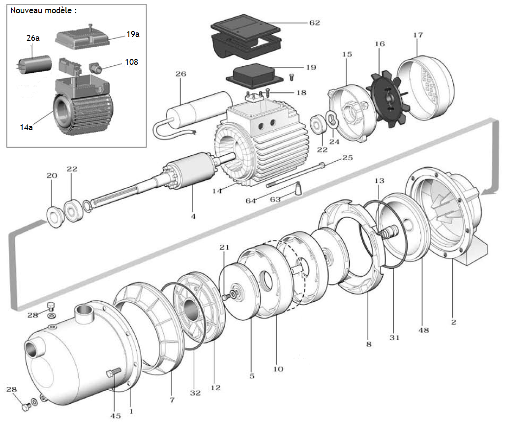 "Pompe centrifuge multicellulaire, horizontale et auto-amorçante, particulièrement indiquée pour le montage de petits et moyens groupes de surpression. Elle peut aspirer des liquides mélangés à de l’air ou de l’eau