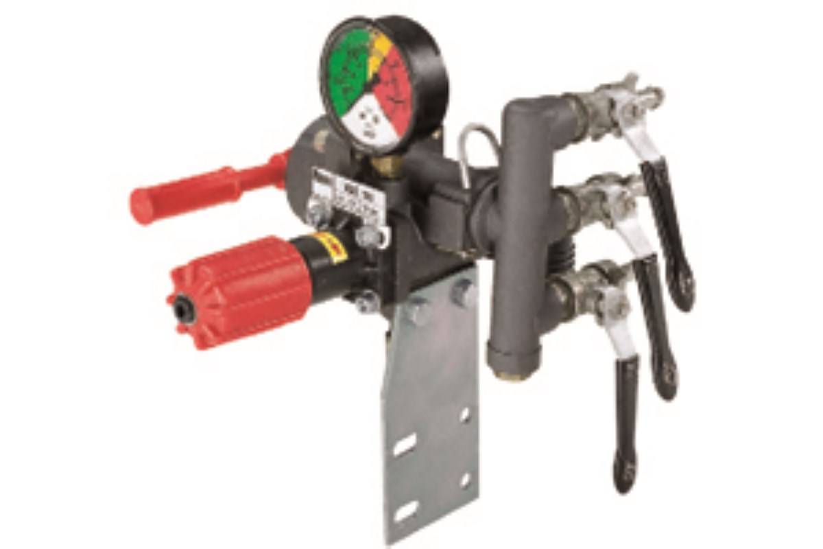 Groupe de commande avec vanne de régulation de pression de travail, levier d’ouverture/fermeture et équipé d’un manomètre avec cadran coloré.