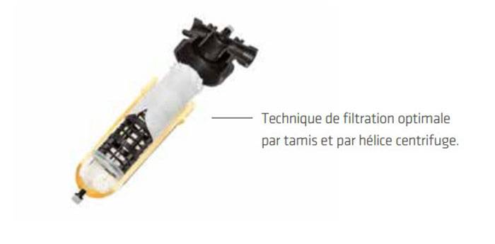 L’hélice CINTROPUR® transforme le flux d’eau en un effet centrifuge par la précipitation des particules lourdes dans le bas de la cloche tandis que le tamis filtrant assure la filtration finale suivant la finesse choisie.