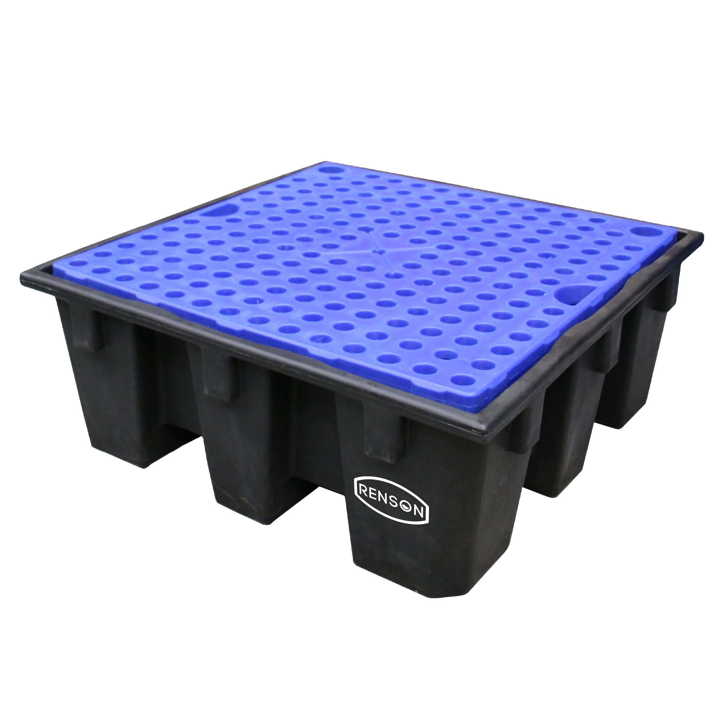 Le bac de rétention de 450 litres est conçu pour contenir 4 futs. Il est fabriqué en polyéthylène haute densité (PEHD) avec un caillebotis amovible en plastique. Ce bac est emboîtable pour optimiser l'espace de transport et de stockage. Il mesure 1300 x 1300 x 485 mm. Il supporte une charge maximale de 1100 kg et possède des passages de fourches sur deux côtés pour une manipulation facile. Il est adapté à l'utilisation de palettes Europe et optimise l'espace de stockage et de transport.