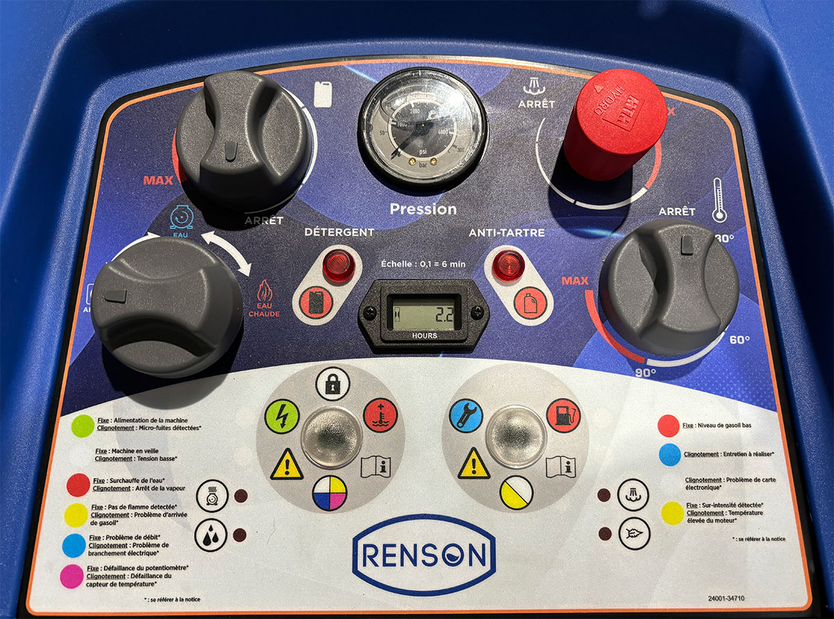 Panneau de contrôle intuitif grâce à ses différents voyants lumineux affichant les niveaux bas des différents liquides, le suivi de la maintenance... etc