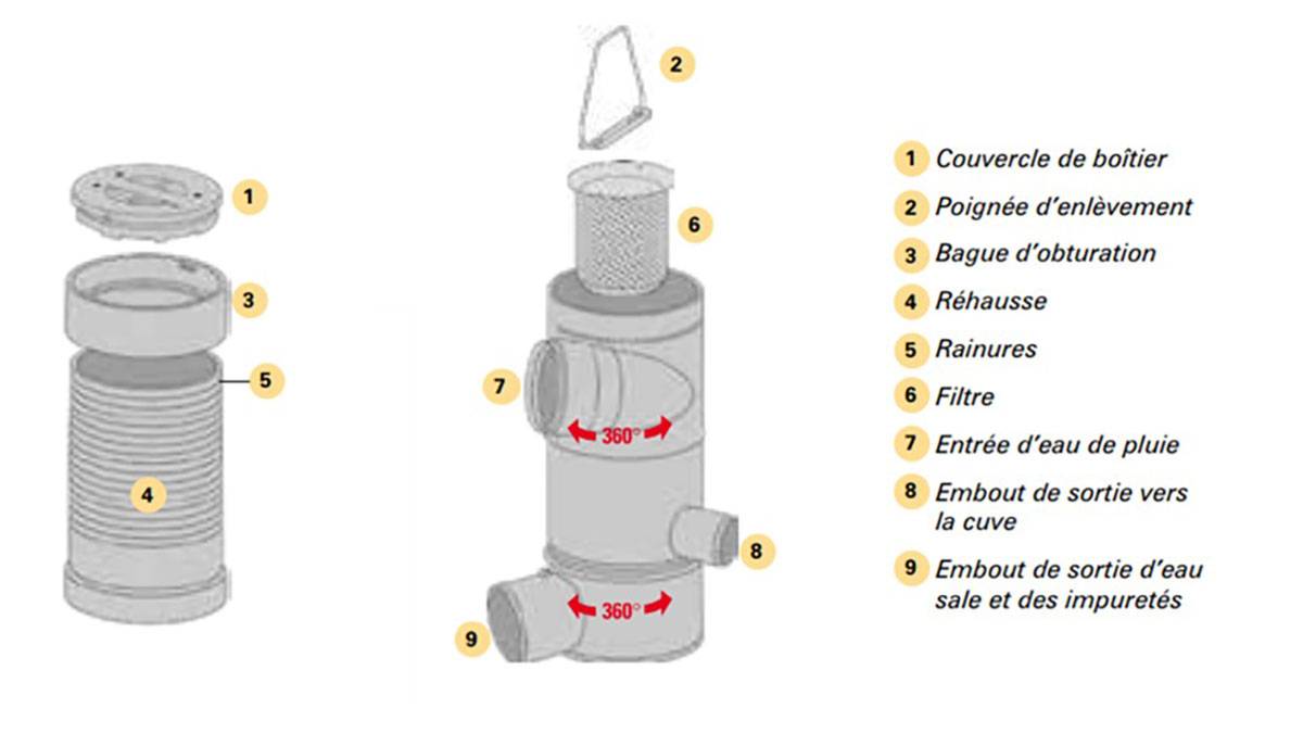 Fonctionnement : l'eau de pluie provenant de la toiture s'écoule latéralement et se distribue sous le filtre cylindrique mit en place verticalement.