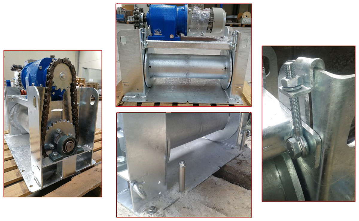 Les treuils sont de conception robuste (en acier galvanisé) avec un entraînement pignon-chaîne ainsi qu’un moteur réducteur qui entraîne une faible consommation électrique.