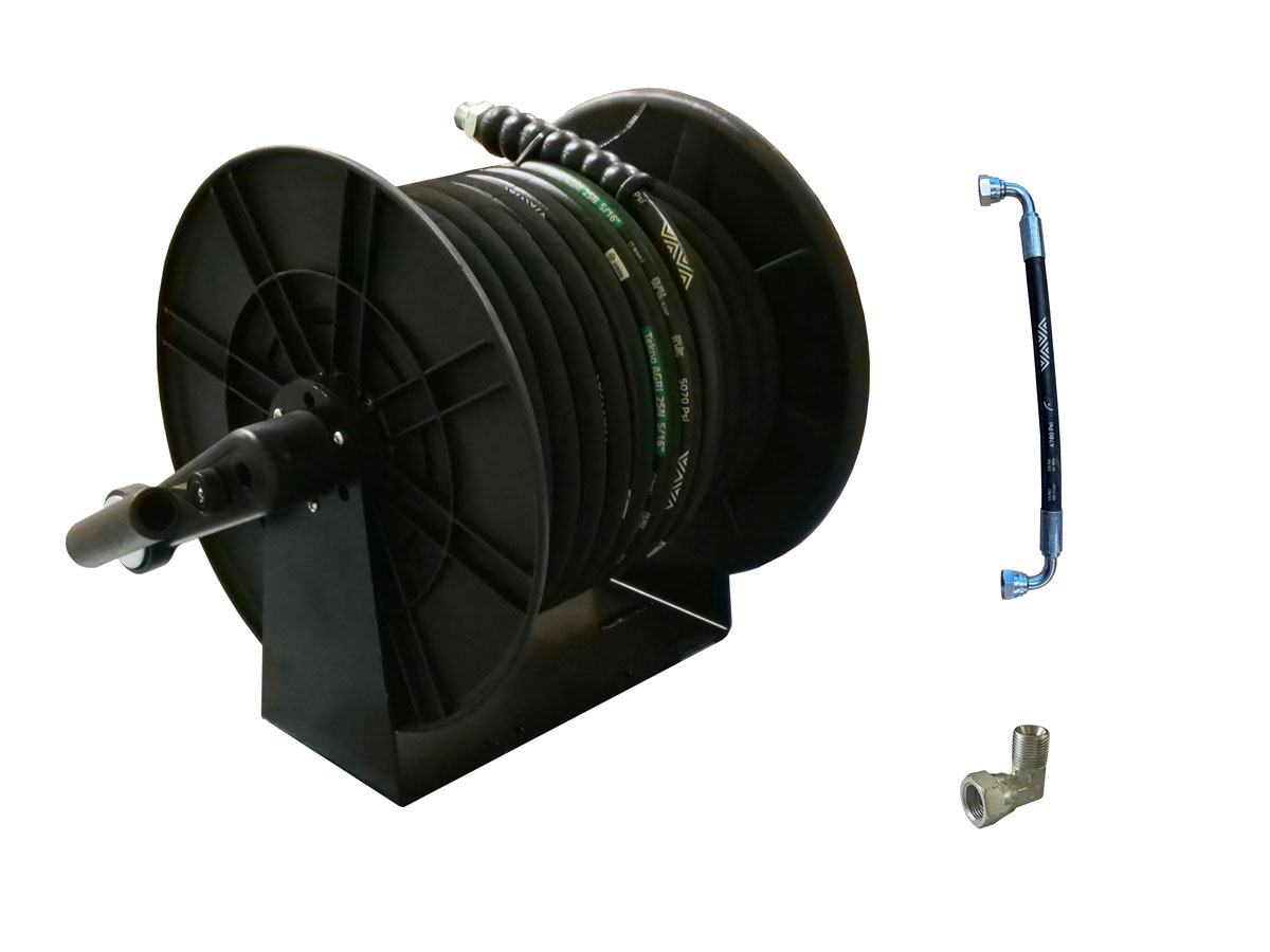 Enrouleur haute pression manuel en plastique équipé d'un flexible 3/8'' de 10 mètres de flexible HP renforcé avec 2 tresses métalliques.
