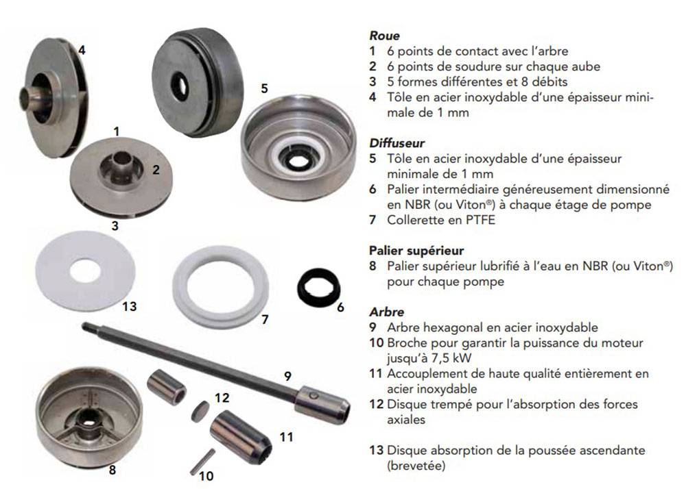 paliers intermédiaires généreusement dimensionnés situés à chaque étage de la pompe
