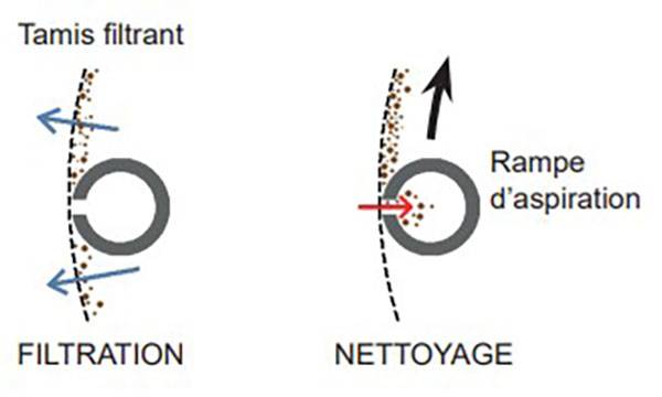 Le nettoyage est réalisé par une rampe aspirante, qui effectue un contre-lavage focalisé au niveau des ouvertures de la rampe.