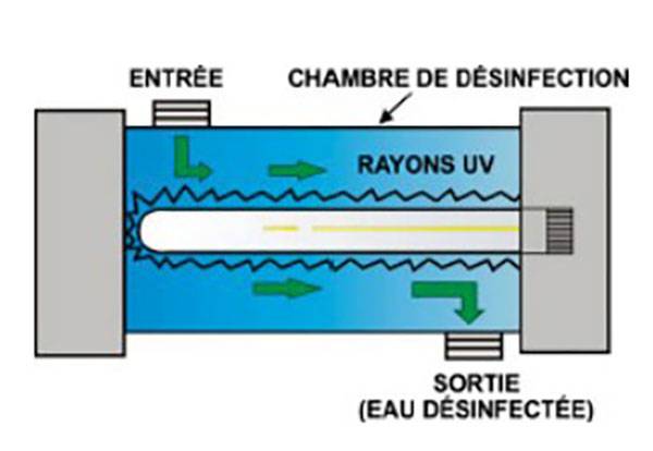 L’eau circule à travers un récipient contenant une lampe UV. Durant le passage de l’eau dans le récipient, les micro-organismes sont exposés à une énergie lumineuse ultraviolette intense qui endommage les molécules génétiques (les acides nucléiques, soit l’ADN et l’ARN) nécessaires à la reproduction. Ces lésions empêchent le micro-organisme de se multiplier.
