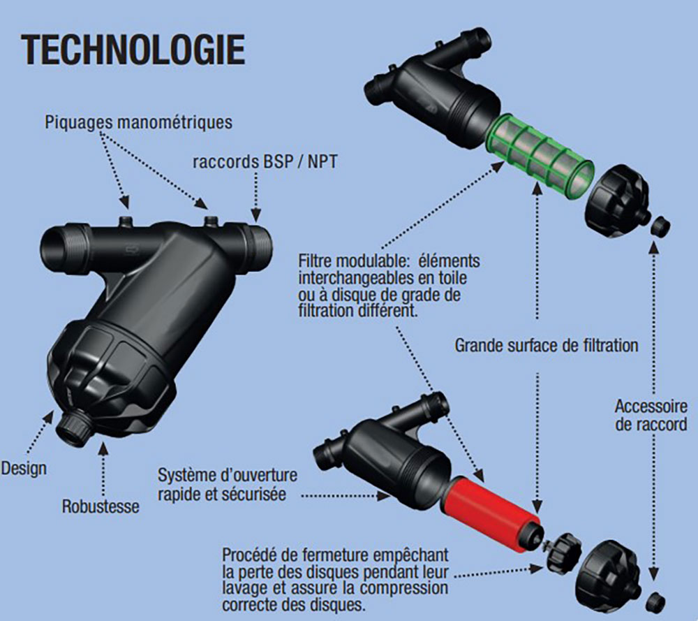 - Eléments filtrants : tamis 130 microns en acier inoxydable AISI 316