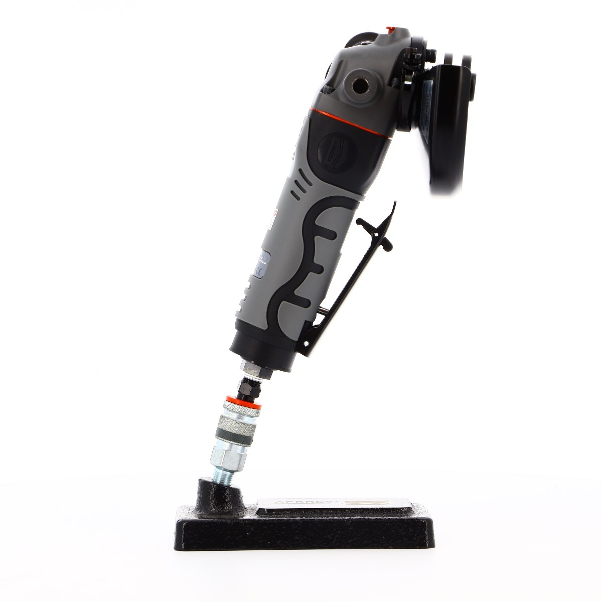Grâce à son échappement canalisé, son volume sonore est réduit et l’échappement de l’air est déporté de l’utilisateur. Équipée d’une vis pour le blocage de l’écrou, cette meuleuse garantit une sécurité optimale pour l’utilisateur. La conception de cette meuleuse offre une meilleure prise en main pour les travaux de longue durée. L’inclinaison de la tête de meule offre également une utilisation plus ergonomique.