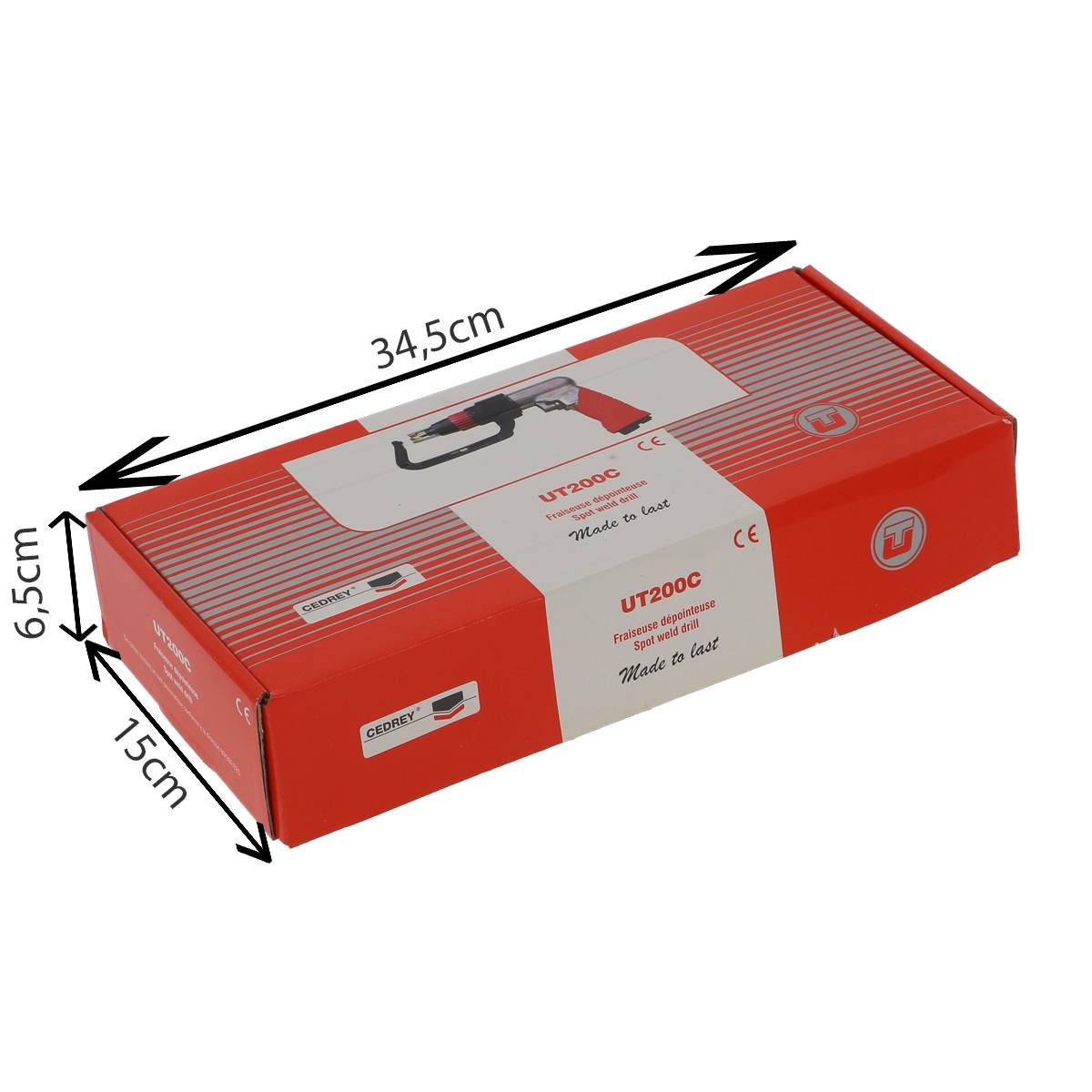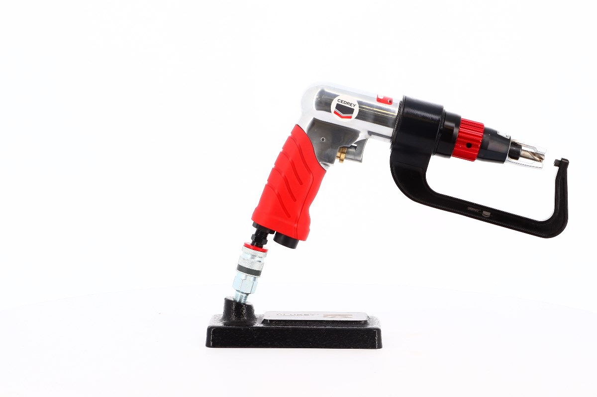 "Fraiseuse-dépointeuse revolver nouvelle génération. Son col de cygne a une butée réglable et orientable sur 360°. Poignée avec gaine isolante, silencieux incorporé, avance de la tête micrométrique par molette crantée, gâchette à double crans, le premier approche le foret et actionne une rotation lente, le second enclenche la rotation rapide et actionne la pression du foret sur la tôle. Peut être utilisée avec les tôles à très haute résistance (THLE, UHLE & USIBOR).