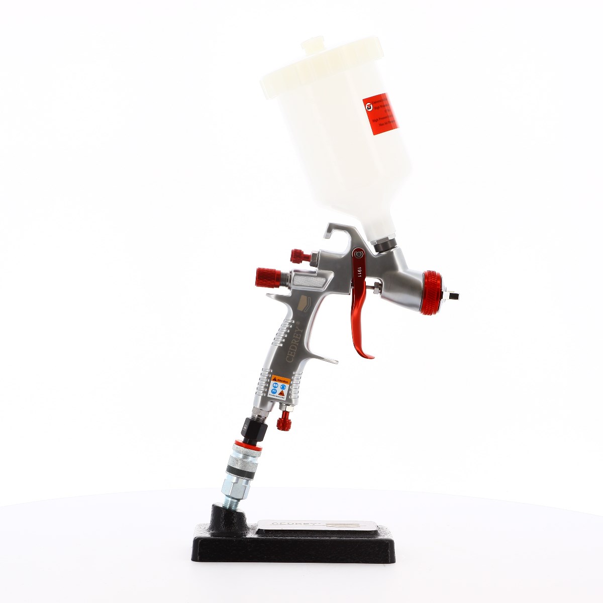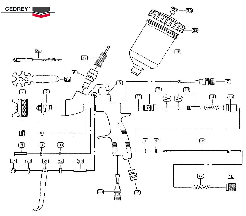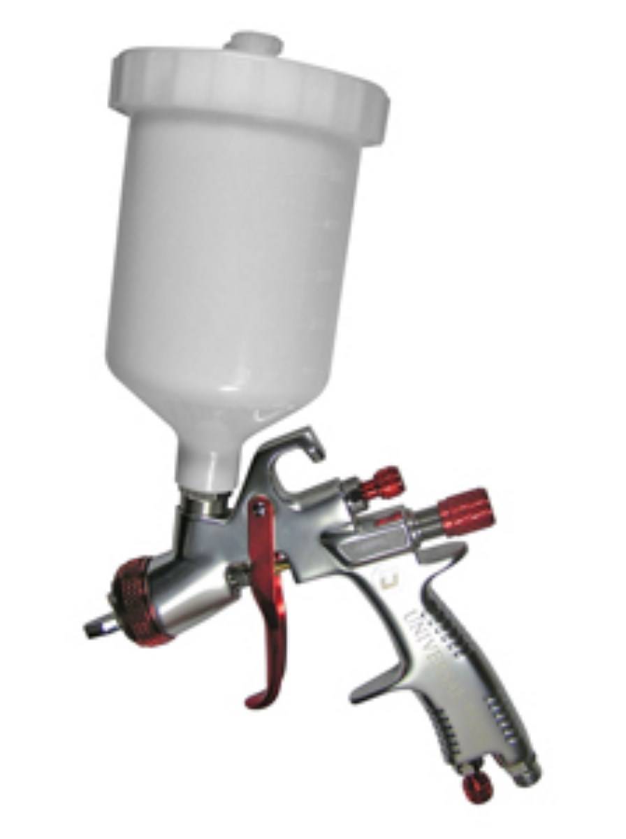 "Pistolet à gravité, sa buse ainsi que son aiguille en acier inoxydable le rendent bien adapté aux peintures et vernis hydrosolubles. Corps en aluminium et godet en plastique lui confèrent légèreté et solidité. Réglage du débit d'air, du débit de produit et de la forme du jet par 3 molettes.
