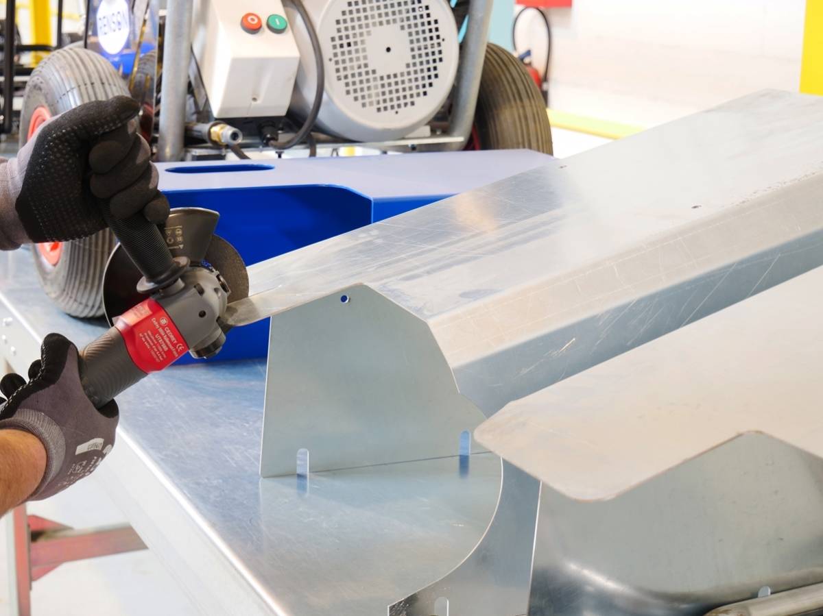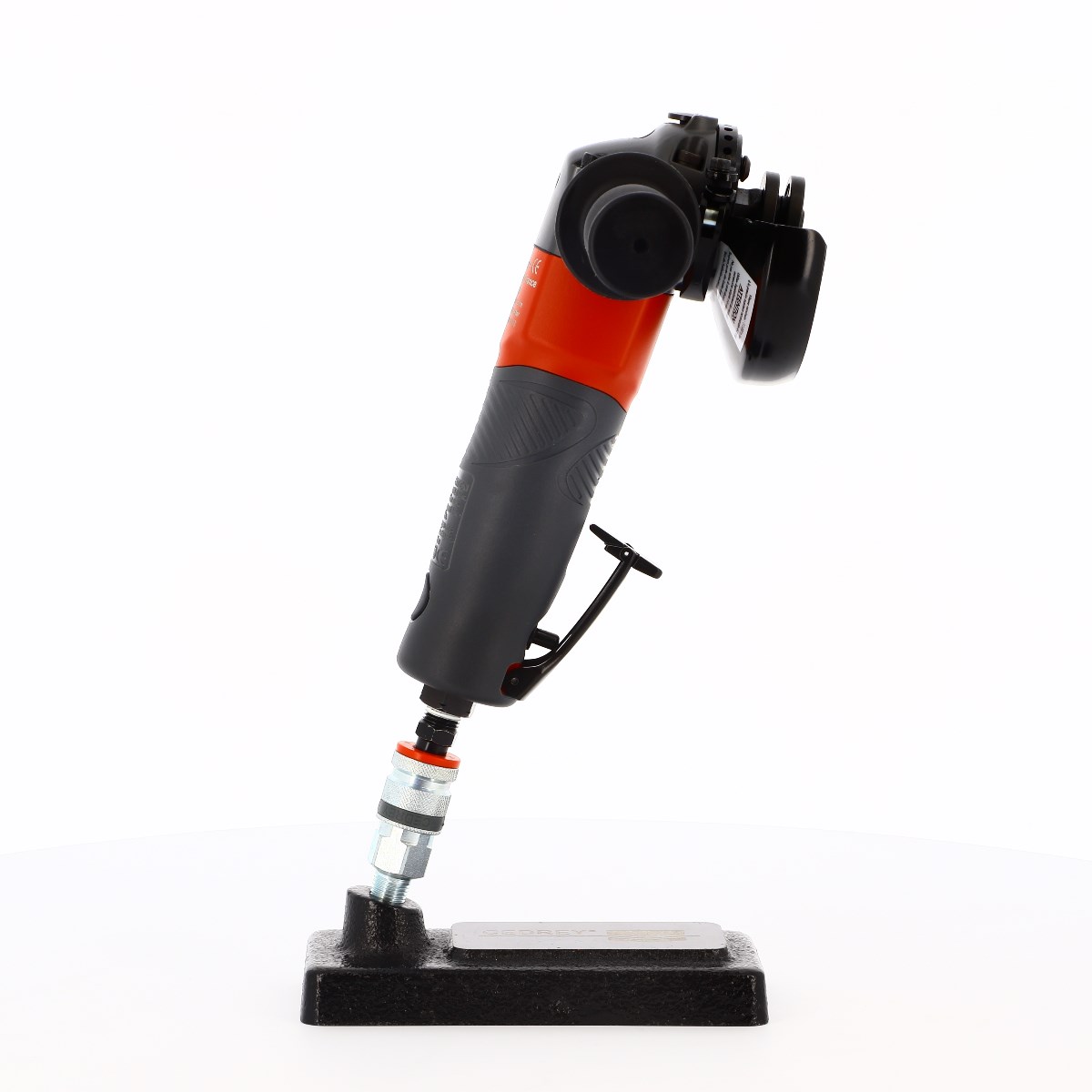 Nouvelle meuleuse révolutionnaire par ses très nombreux avantages. Ergonomie parfaite grâce à sa tête inclinée à 100°, son corps isolé, sa poignée auxiliaire anti- vibratile adaptée aux droitiers comme aux gauchers. Sécurité exceptionnelle grâce à son carter pivotant sur 110° par simple pression sur une gâchette, son blocage des meules et des disques par écrou plus vis centrale. Fiabilité grâce à son moteur puissant, la protection du blocage de l'arbre et son point de graissage du renvoi d'angle facilement accessible. Versatilité grâce à sa broche en M14 qui permet de monter les accessoires des meuleuses électriques